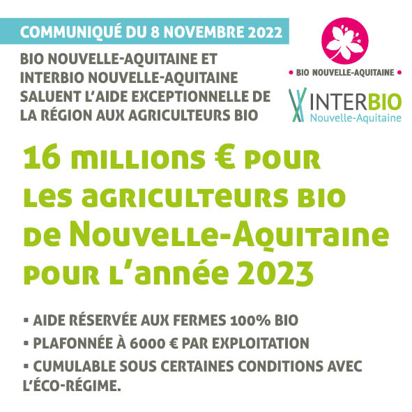 Dans le contexte actuel avec d’une part, l’urgence climatique et d’autre part, une conjoncture économique difficile pour les filières biologiques, Bio Nouvelle-Aquitaine et INTERBIO Nouvelle-Aquitaine saluent l’annonce de la Région Nouvelle-Aquitaine et de son Président, Alain Rousset, d’un soutien exceptionnel aux agriculteurs bio sous la forme d’une aide de 16 millions pour l’année 2023.