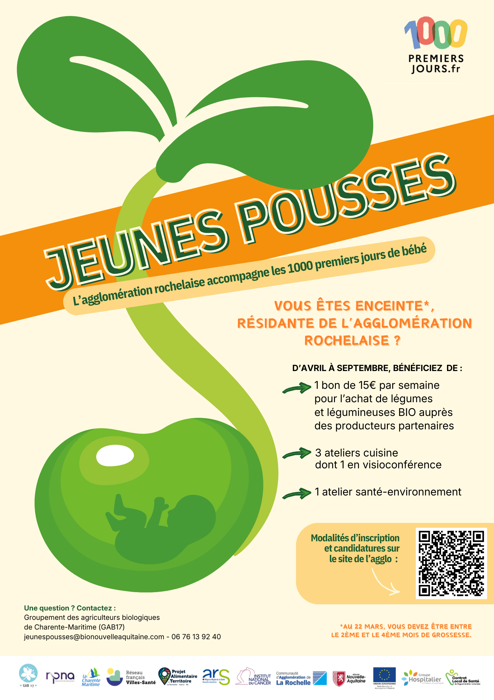Le programme Jeunes pousses est porté par la Communauté d’Agglomération de la Rochelle dans le cadre du Contrat local de santé et le Groupe Hospitalier La Rochelle Atlantique, en cohérence avec le Projet Alimentaire de Territoire La Rochelle-Aunis-Ré. Il est coordonné par le Groupement des Agriculteurs Biologiques de Charente-Maritime (GAB 17) et associe la Protection maternelle et infantile, le Réseau Périnat Nouvelle-Aquitaine et le réseau français Villes-Santé.